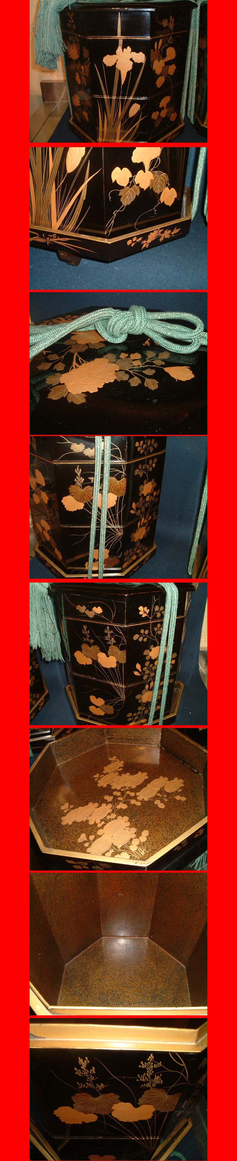黒漆金蒔絵の傷みの少ない貝桶一対白木外箱付です。 |