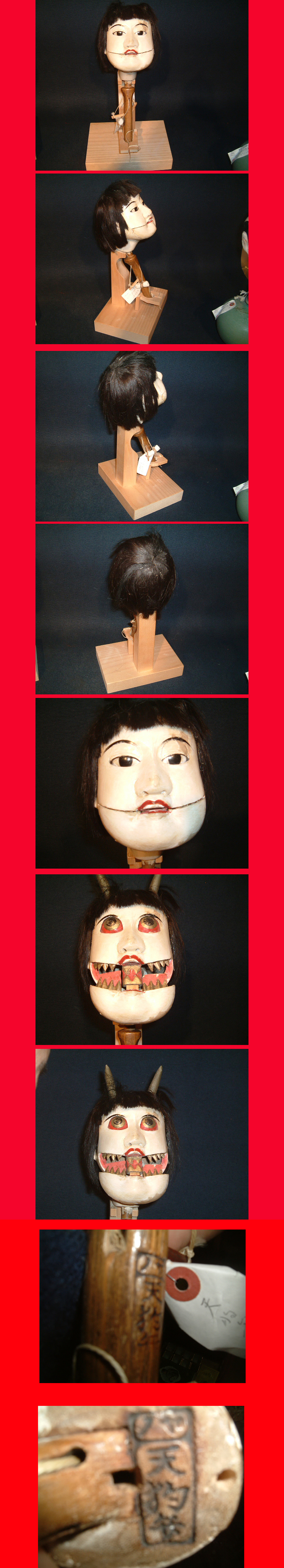 文楽頭、天狗弁ガブです。 台付き全体サイズは巾19.5cm 高さ36cm 奥行き19cm 人形高さ(棒を含む)30cm この様なお品は早々お目にかかる事も無いと思います。 近藤弁吉の作品です。100年以上経たお品で常に使用されていた物で 使用痕、傷み、直し有ります。 天狗弁の焼印有ります (一口メモ)本名、近藤弁吉。初代天狗久の甥で、明治6(1873)年12月25日徳島県名西郡入田村矢野奥谷にて板橋浅吉の2男に生れた。14歳にて天狗久の門に入り、24歳で独立して天狗弁と名のった。昭和44年3月死亡した。94歳。 |